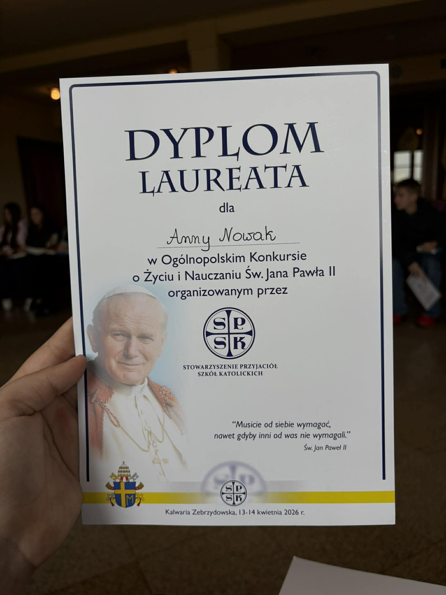 W dniach 13–14 kwietnia w Kalwarii Zebrzydowskiej odbył się finał Ogólnopolskiego Konkursu Wiedzy o Janie Pawle II. Uczestnicy musieli wykazać się szeroką i szczegółową wiedzą o życiu oraz nauczaniu naszego wielkiego Rodaka. Poziom konkursu był bardzo wysoki, a rywalizacja wymagająca.