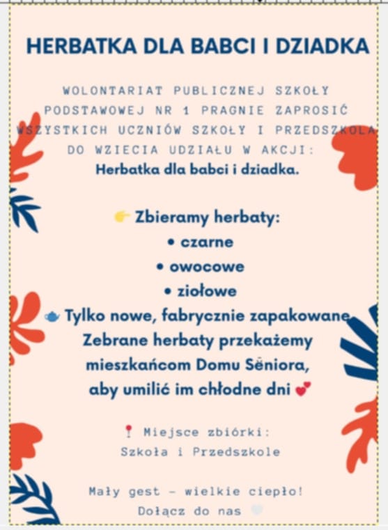 Do końca stycznia wolontariat zbiera ,,Herbatkę dla babci i dziadka", które później chcemy przekazać dla Domu Seniora aby umilić im pobyt tam i wspólne wieczory. Zapraszamy wszystkich do wzięcia udziału naszej akcji.