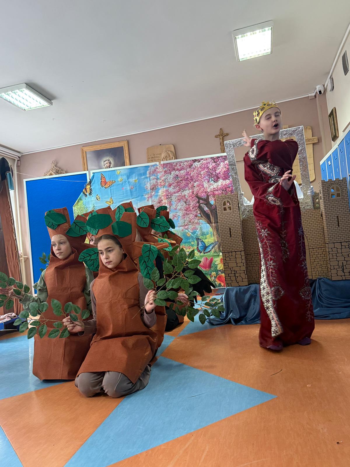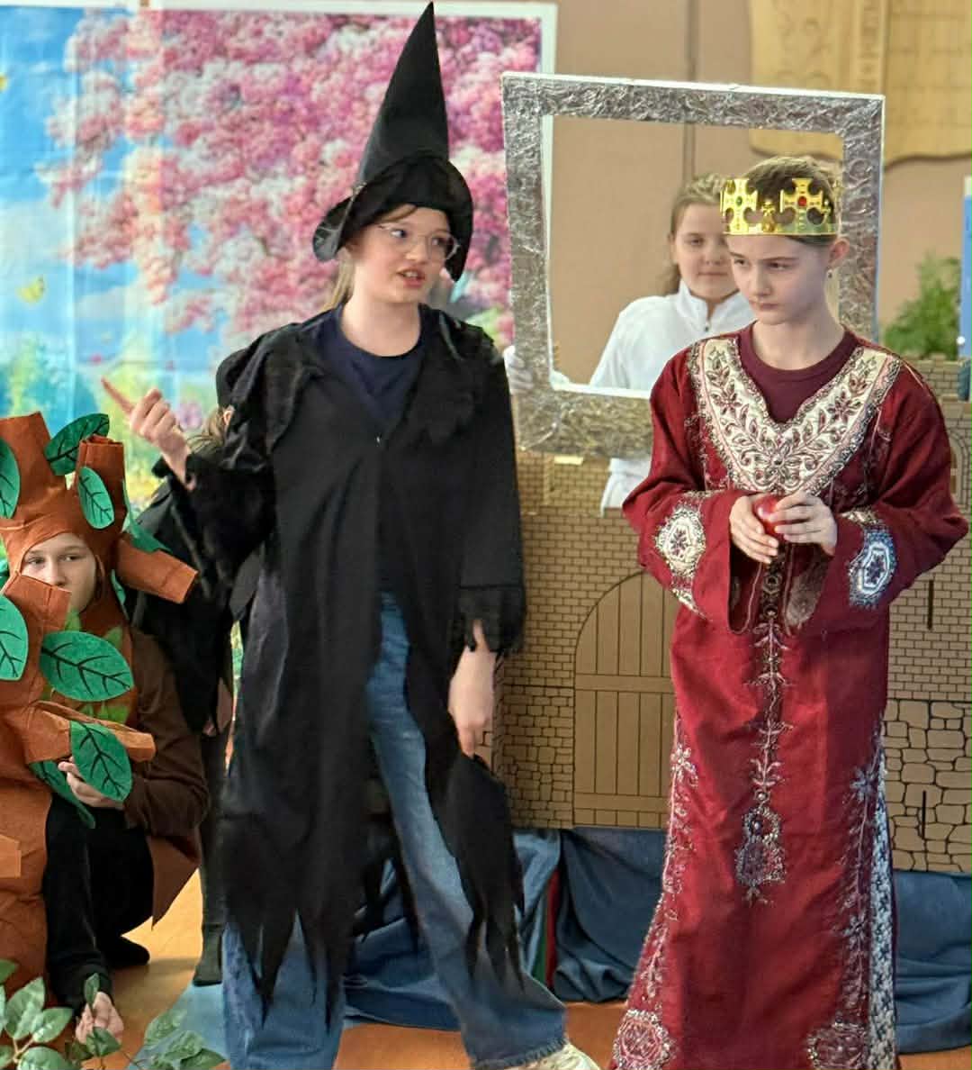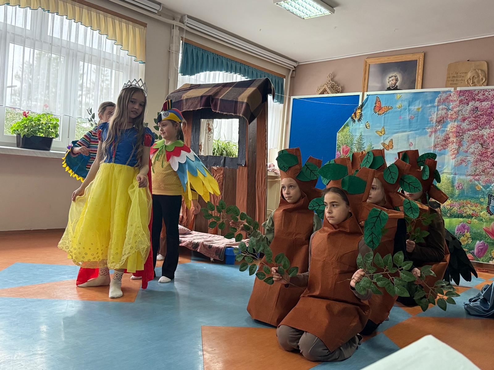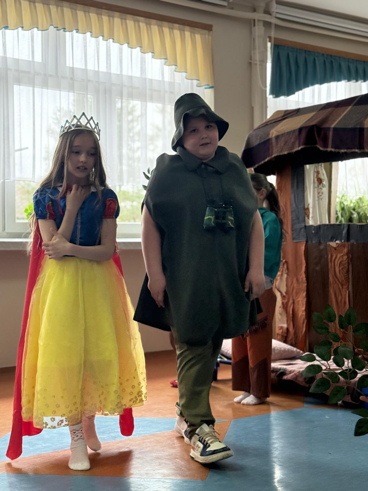 Dzisiaj nasze przedszkolaki miały okazję uczestniczyć w wyjątkowym wydarzeniu – przedstawieniu pt. „Śpiąca Królewna”, przygotowanym przez uczniów szkoły podstawowej. Spektakl dostarczył wszystkim wielu pozytywnych emocji – dzieci z zainteresowaniem śledziły losy bohaterów, podziwiały kostiumy oraz scenografię, a także aktywnie reagowały na przebieg przedstawienia.