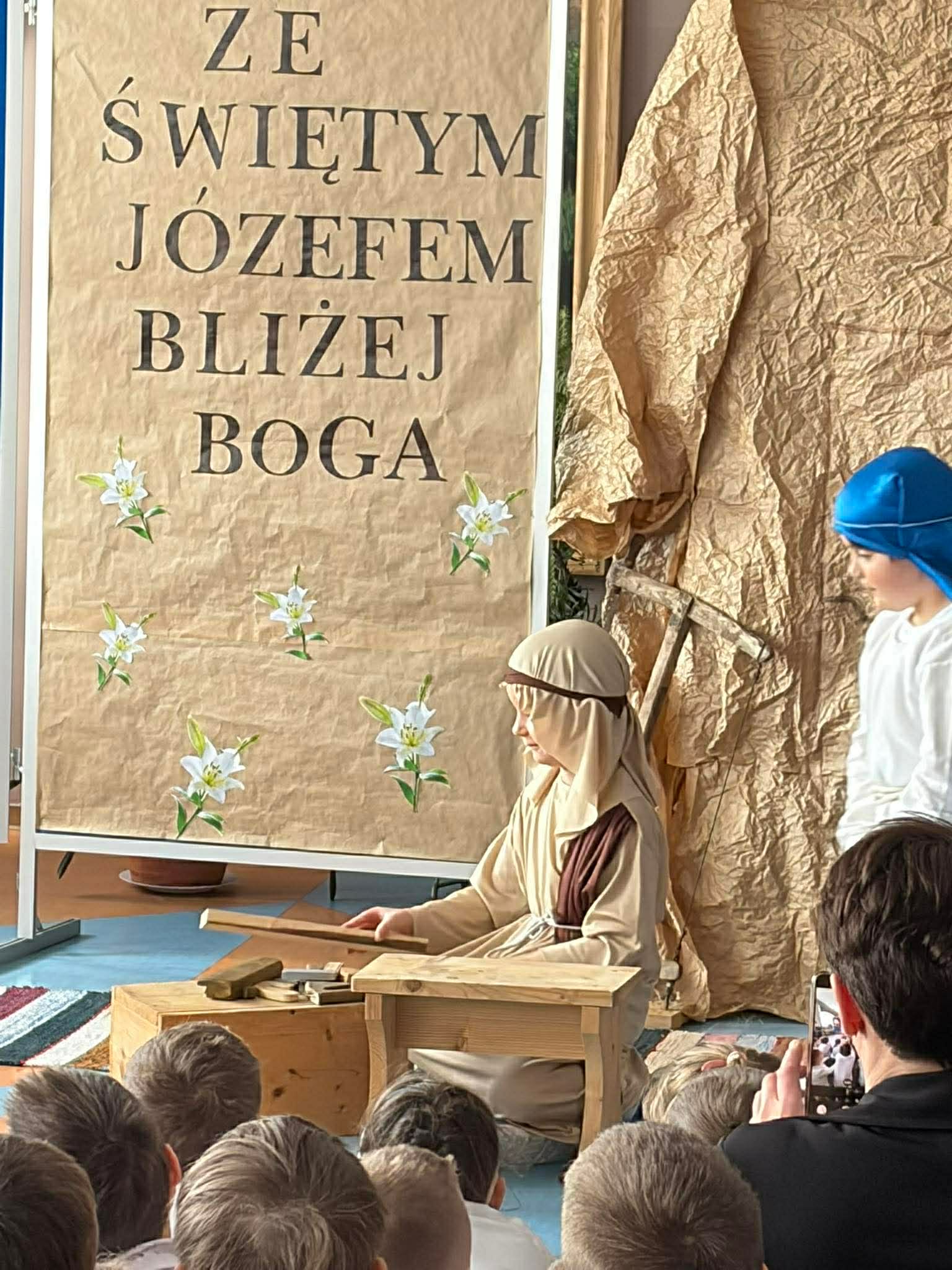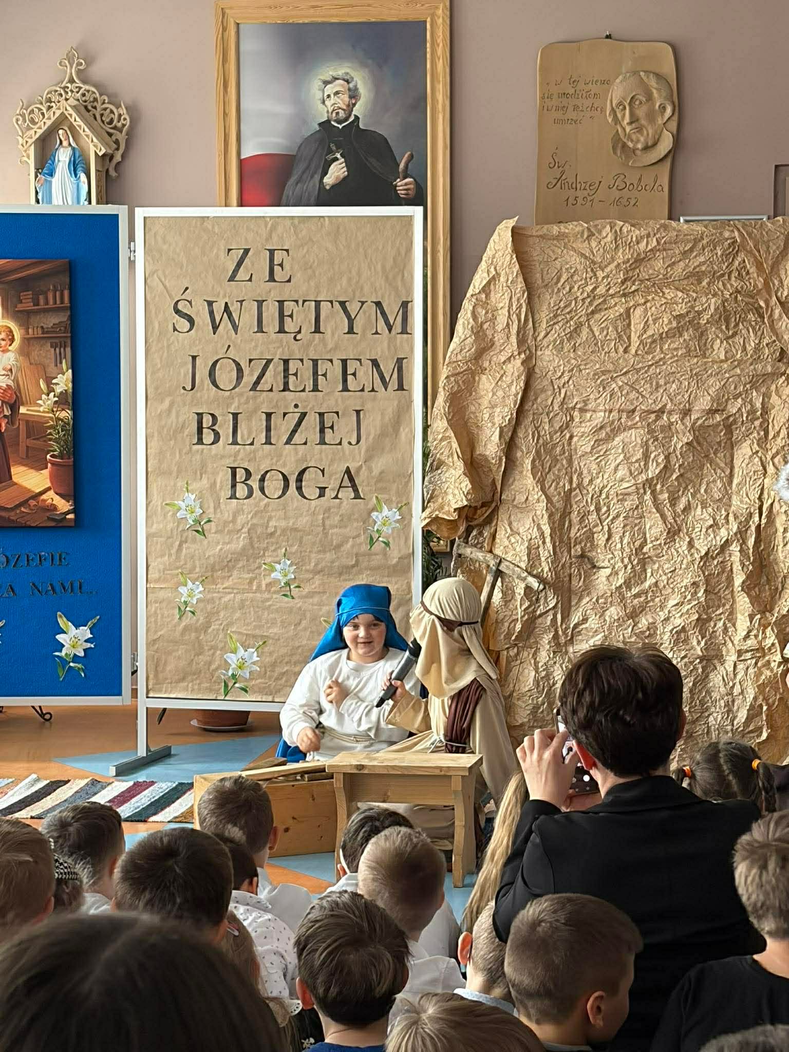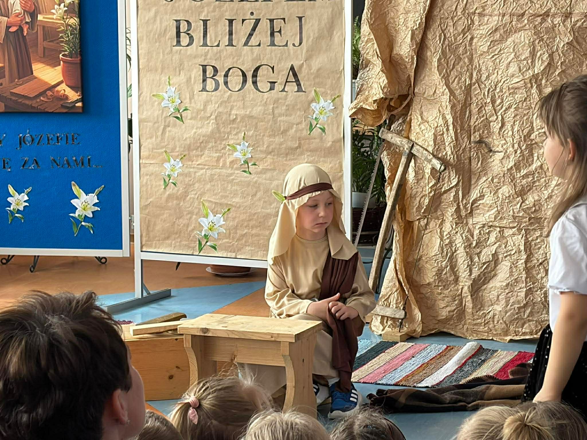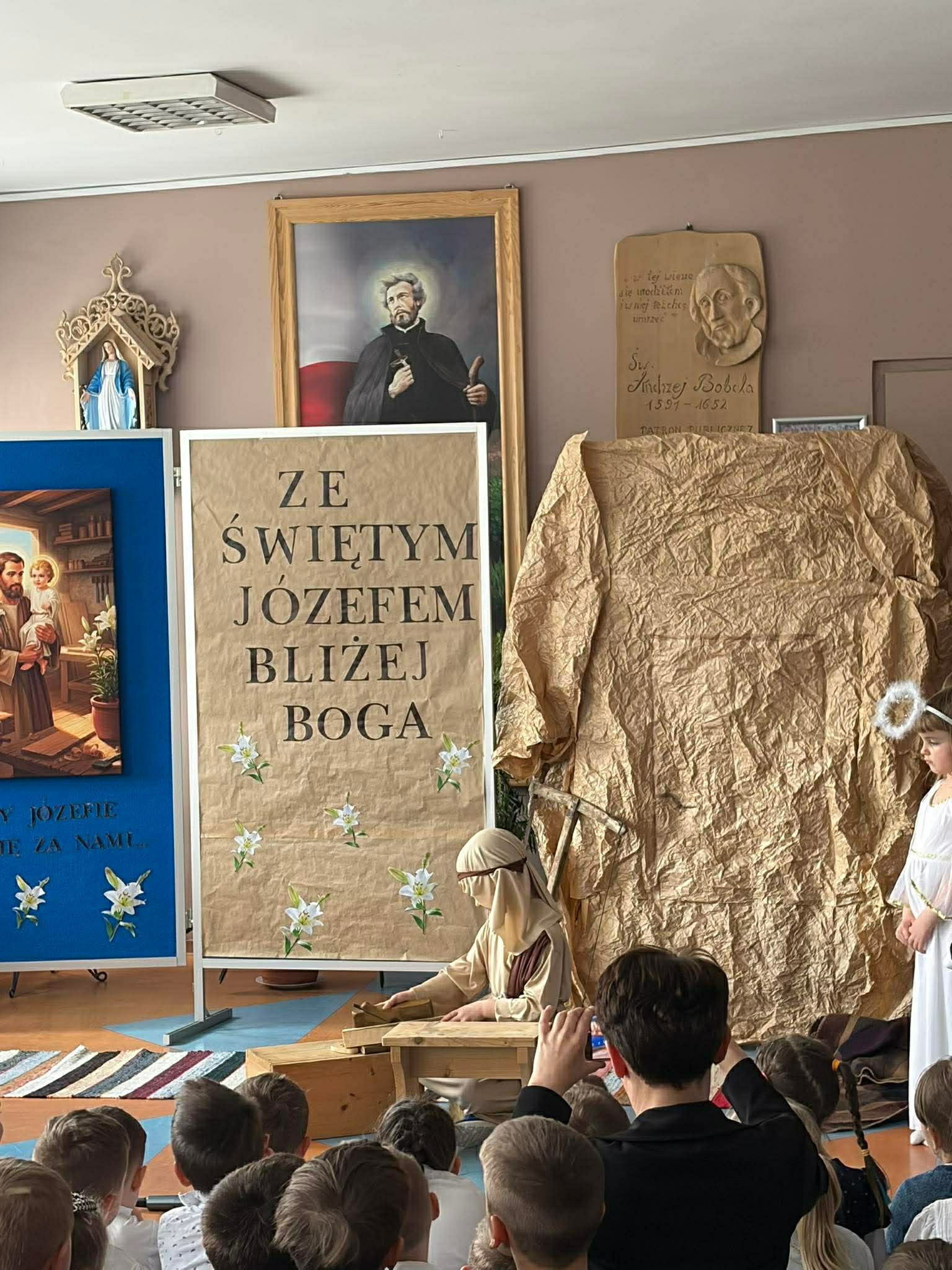 Grupa „Misie” z naszego przedszkola miała dziś zaszczyt wystąpić przed całą społecznością szkolną z okazji uroczystości Świętego Józefa Nasze przedszkolaki z ogromnym zaangażowaniem i radością zaprezentowały przygotowane przedstawienie, przybliżając postać Świętego Józefa jako opiekuna, człowieka pełnego dobroci i wzoru dla każdego z nas. Mali artyści zachwycili publiczność swoją odwagą, szczerością i pięknym występem Jesteśmy bardzo dumni z naszych „Misiów” – ich praca i zaangażowanie zostały nagrodzone gromkimi brawami Dziękujemy wszystkim, którzy pomogli w przygotowaniu tego wyjątkowego wydarzenia!